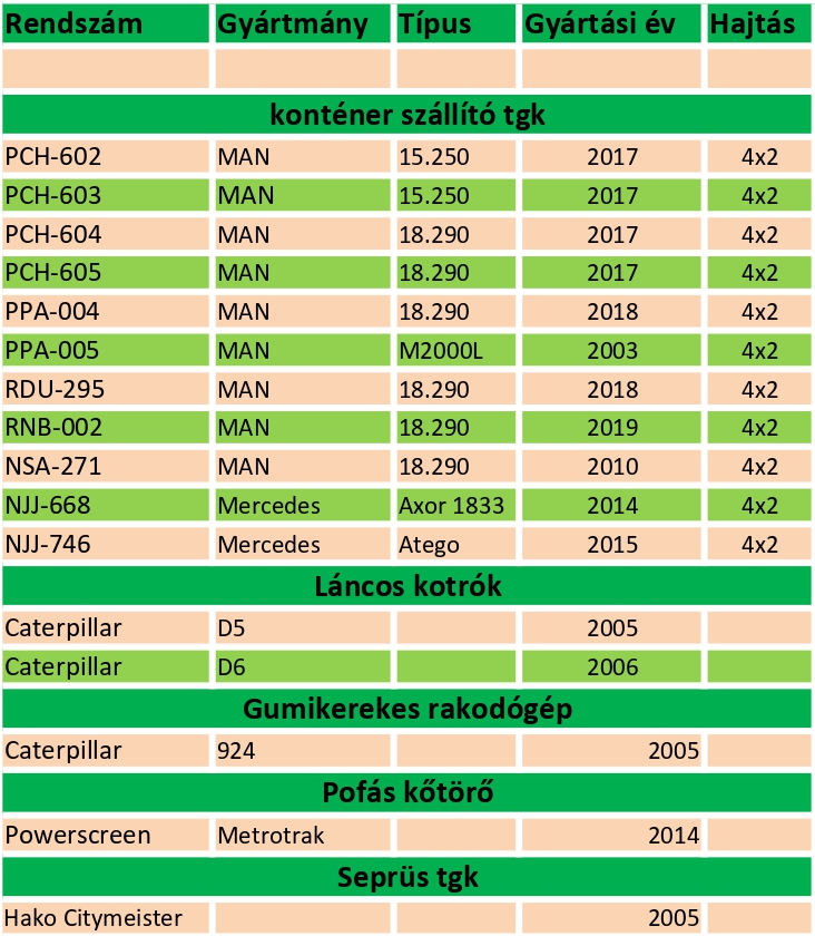 Társaságunk közel 400 db konténerrel (3, 5, 8 és 30 m3) rendelkezik, illetve a szállításukra alkalmas gépparkkal. Konténerrel történik a cégektől, közületektől, lakosságtól plusz hulladékként (pl. bontás során) elszállított egyéb hulladékok elszállítása (pl.: építési törmelék, stb.), melyeket minden esetben külön-külön konténerekben szállítunk el, ezzel kiküszöbölve a hulladékok keveredésének lehetőségét. A konténerrel történő hulladékszállítást néhány megrendelőnk esetében az ország más területeiről is végezzük.